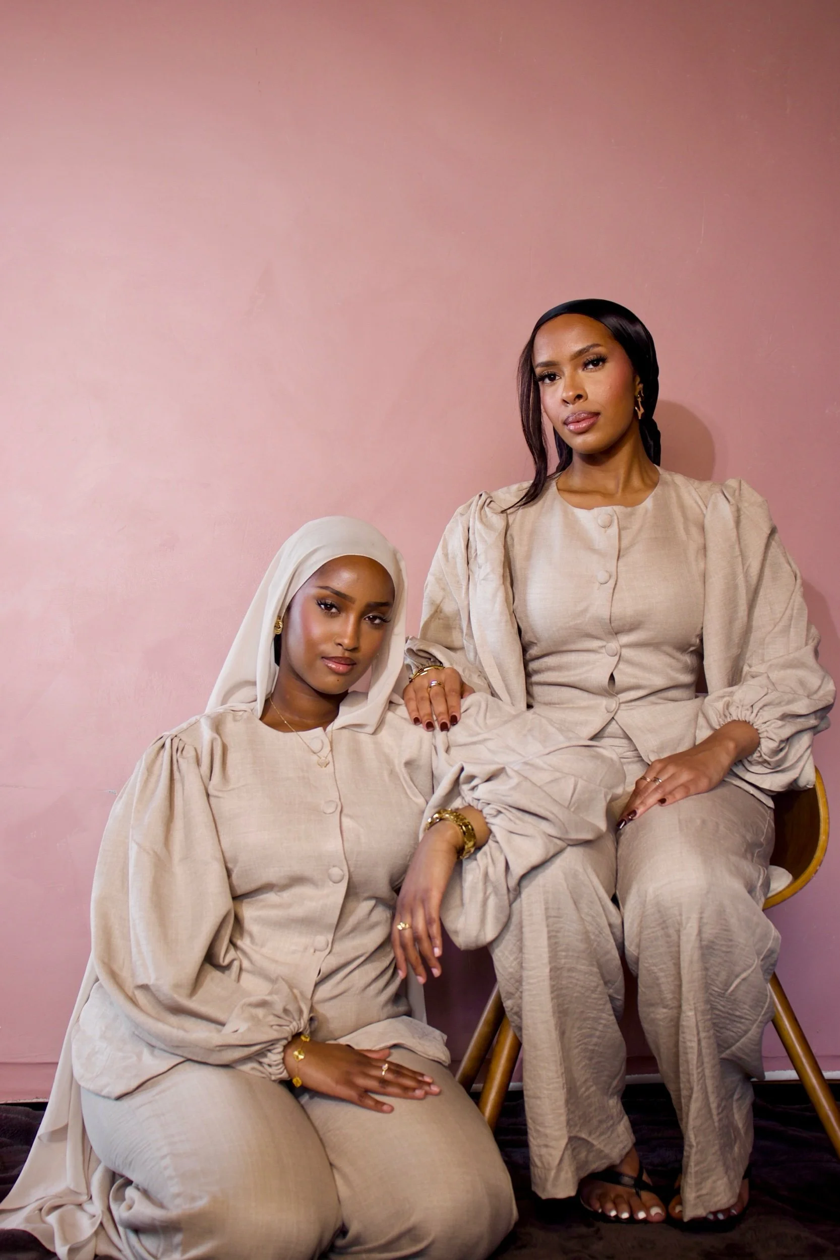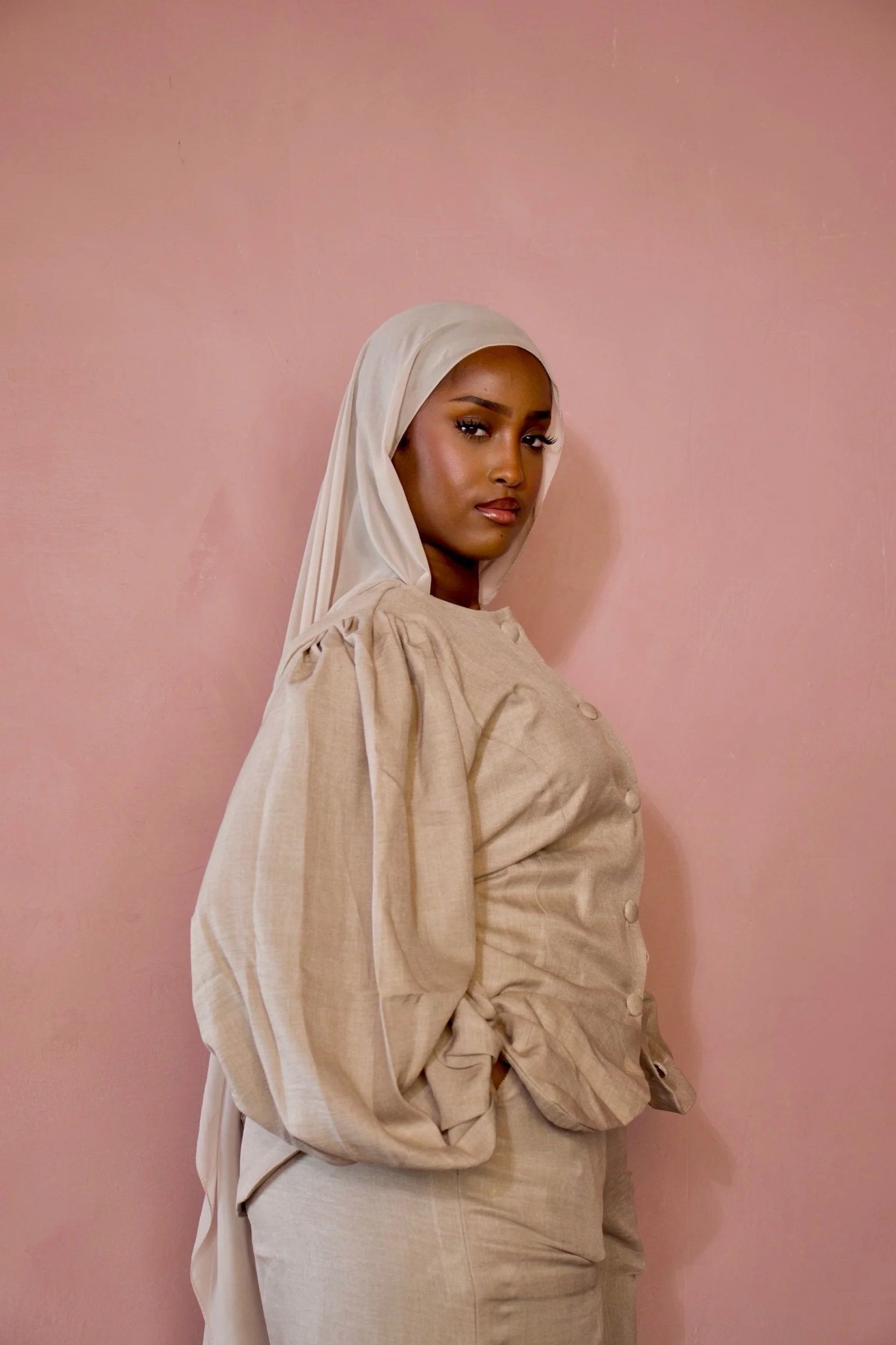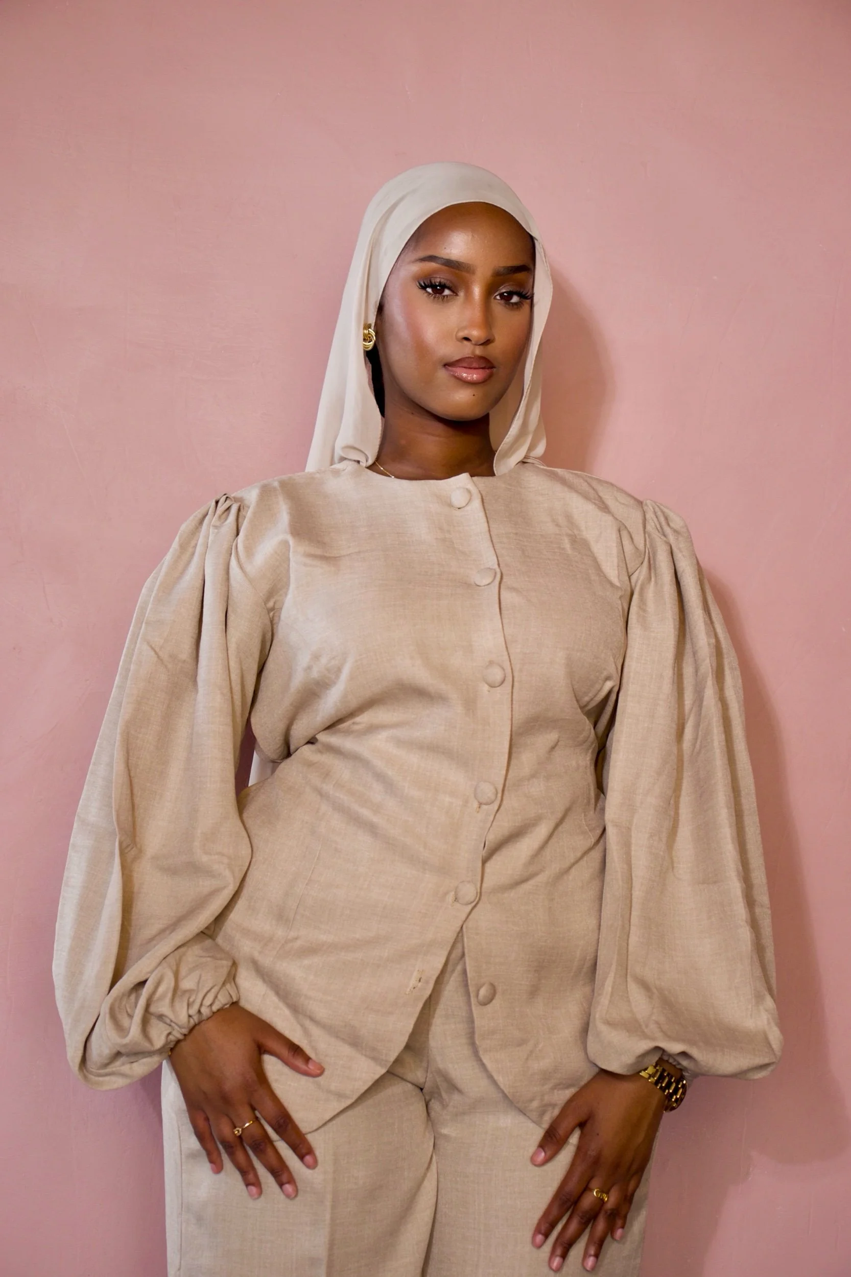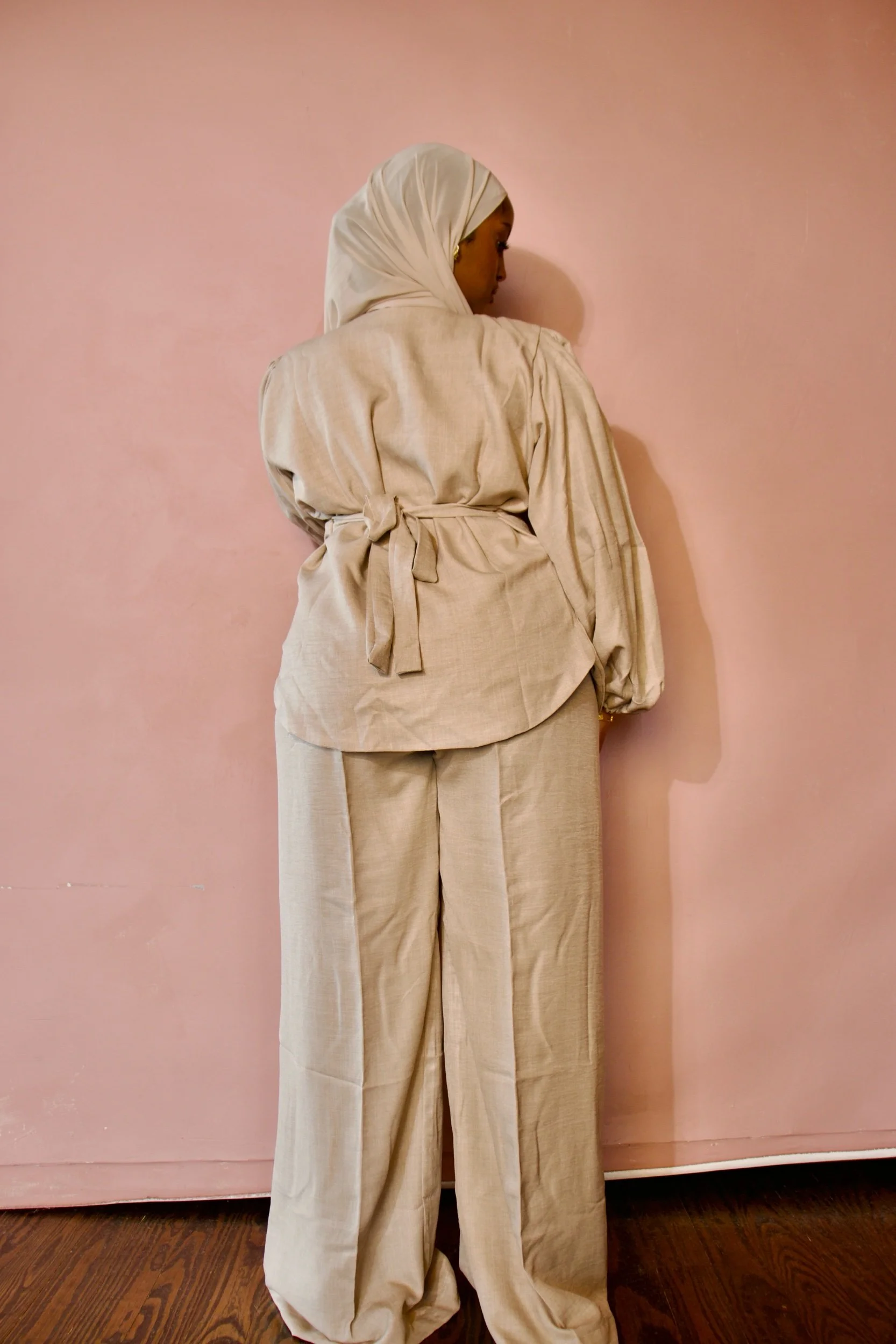 The Adeola Set is a chic two-piece ensemble crafted from soft linen in a warm beige tone. Featuring statement puff sleeves, wide-leg trousers, and practical side pockets, it offers effortless elegance with a flattering tie-back detail for everyday wear.