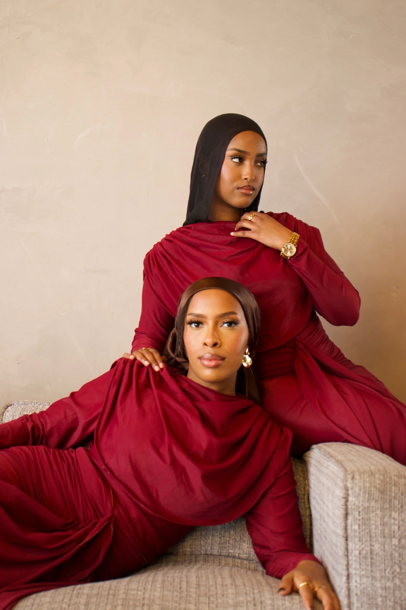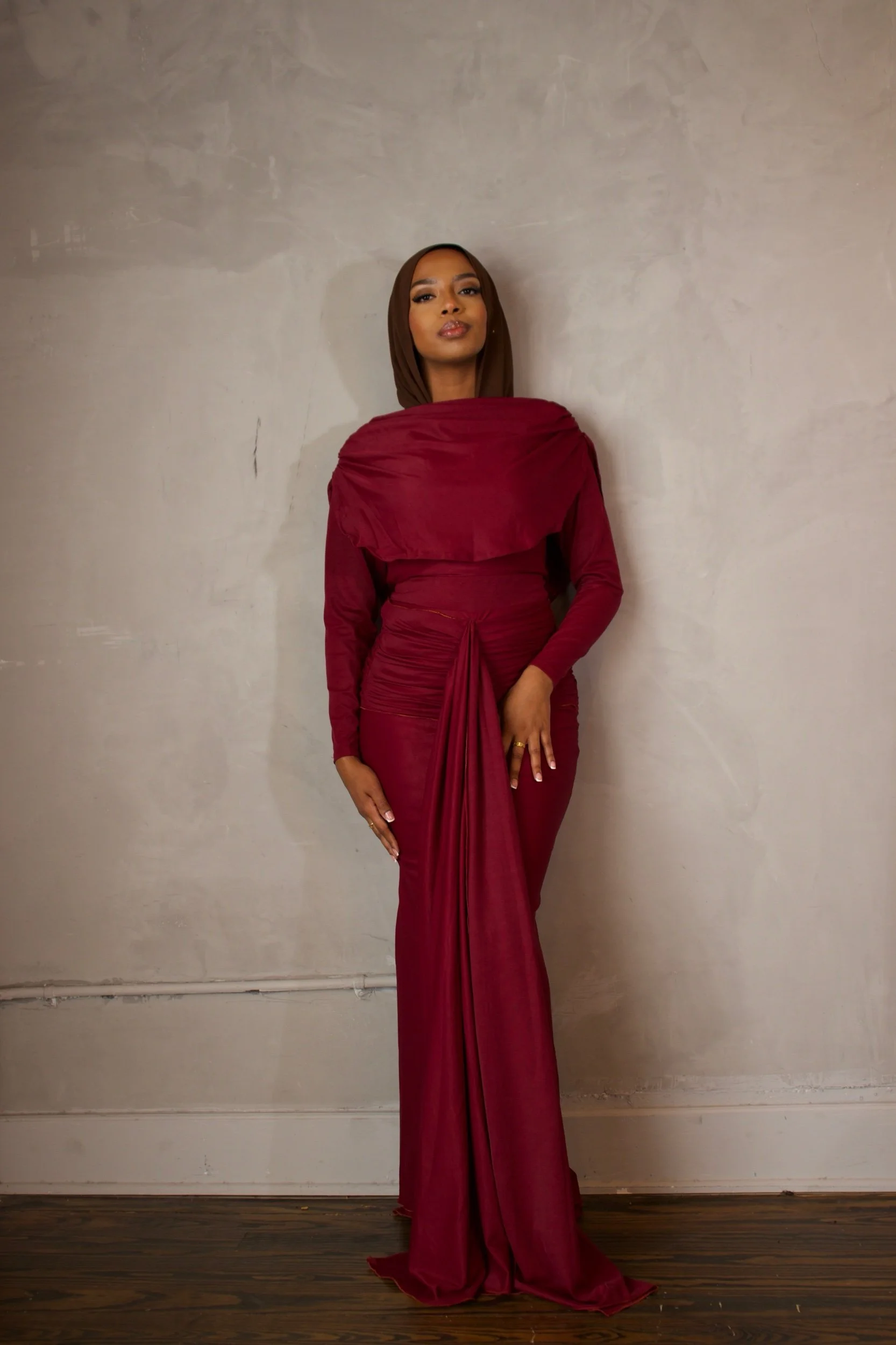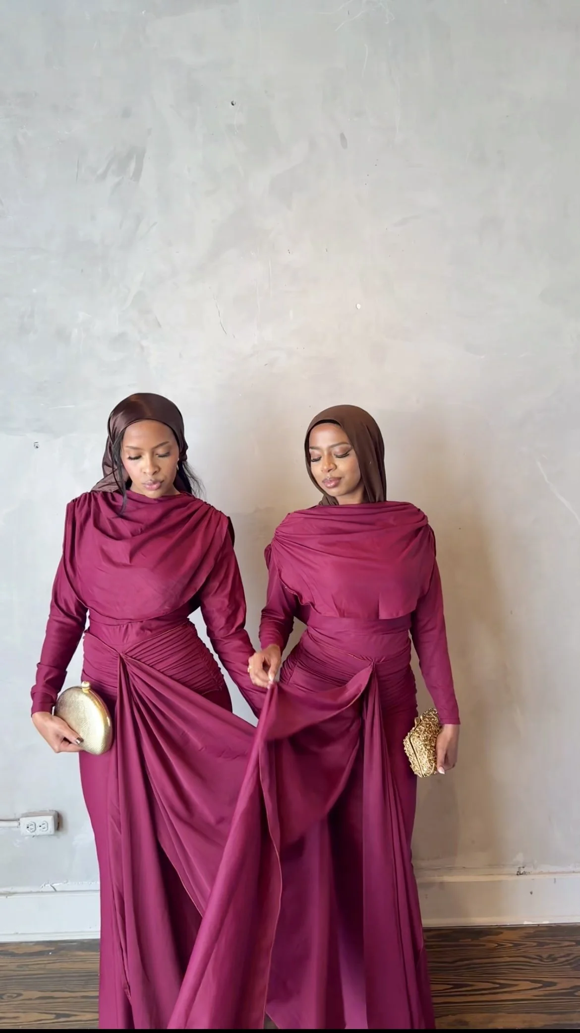 The Yinka Set is all about soft elegance with a bold presence. Designed with a mirrored draped neckline on both the front and back, it falls beautifully while keeping everything modest and refined. The pleated waist and flowing side detail shape the body without clinging, giving you that effortless, elevated look. Finished in a rich burgundy shade that stands out on every skin tone, Yinka is made for weddings, celebrations, and the moments you want to feel unforgettable.